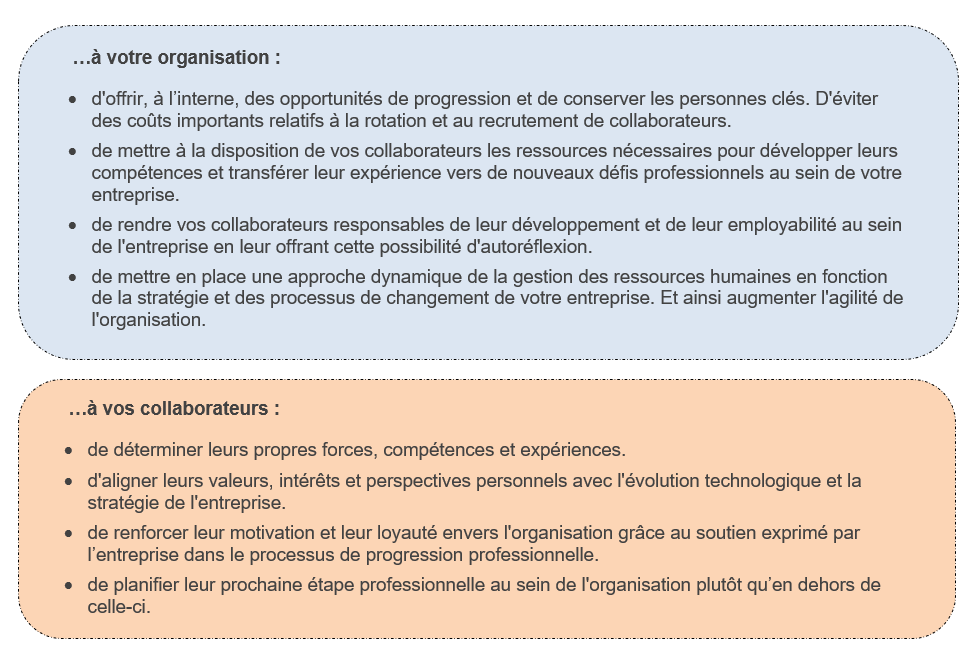 D’une part, cela permet de développer, en interne, le portefeuille de compétences nécessaire à l’avenir pour mettre en œuvre la stratégie de l’entreprise. D’autre part, c’est un témoignage important de reconnaissance envers les personnes clés de votre organisation. Il jette ainsi les bases de la gestion de la rétention, à l’upskilling de vos collaborateurs en passant par la mobilité interne de ceux-ci.