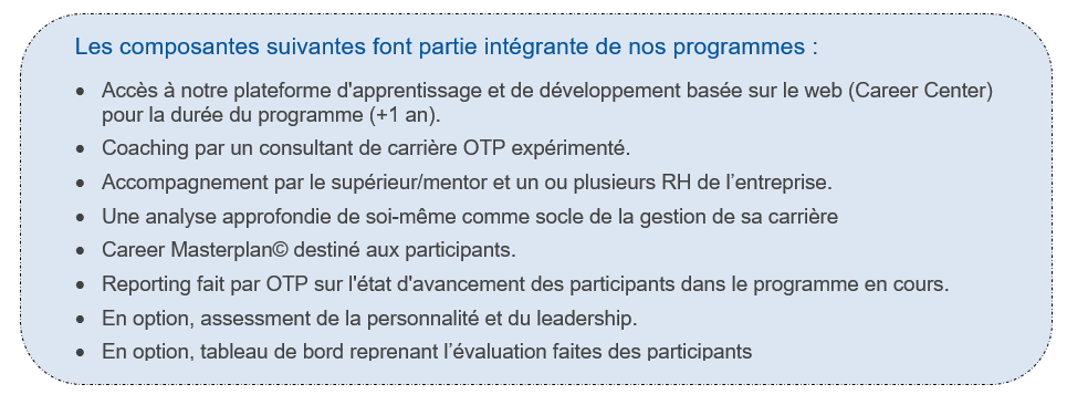Nos programmes de gestion de carrière peuvent être adaptés aux spécificités de votre organisation. En outre, nos programmes peuvent être orientés vers des groupes cibles spécifiques : par ex.
